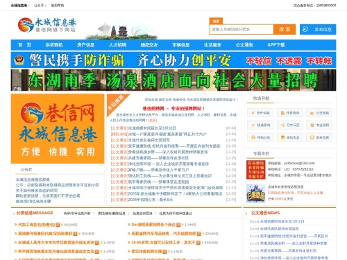 永城信息港,河南省永城市生活类信息网站,宗旨以宣传永城、服务百姓、传递价值为目的;栏目设置:人才招聘、房产信息、车辆信息、交友征婚、供求商机、生活服务、招生信息、热点快讯等。