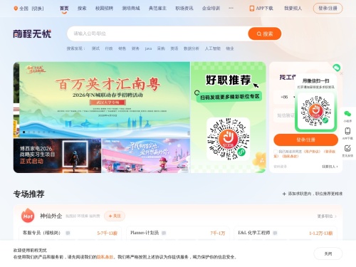 前程无忧人才网面向全国,提供2026准确的招聘网站信息,为企业和求职者提供人才招聘、求职、找工作、培训等在内的全方位的人力资源服务,更多求职找工作信息尽在前程无忧!